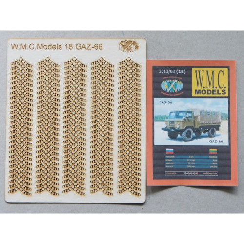 Лазером вырезанные и с выгравированными элементами протектора для покрышек модели грузового вездехода „ГАЗ - 66“, выпускаемой издательством «W. M. C. Models». Детали вырезаны из картона толщиной 1 мм. Вам остается только отделить маленькие соединения и оклеить этими деталями ходовую часть покрышек и покрасить покрышки. Этот набор значительно облегчит Вам работу с моделью, а сама модель станет намного лучше, чем в том случае, если не использовать набор.